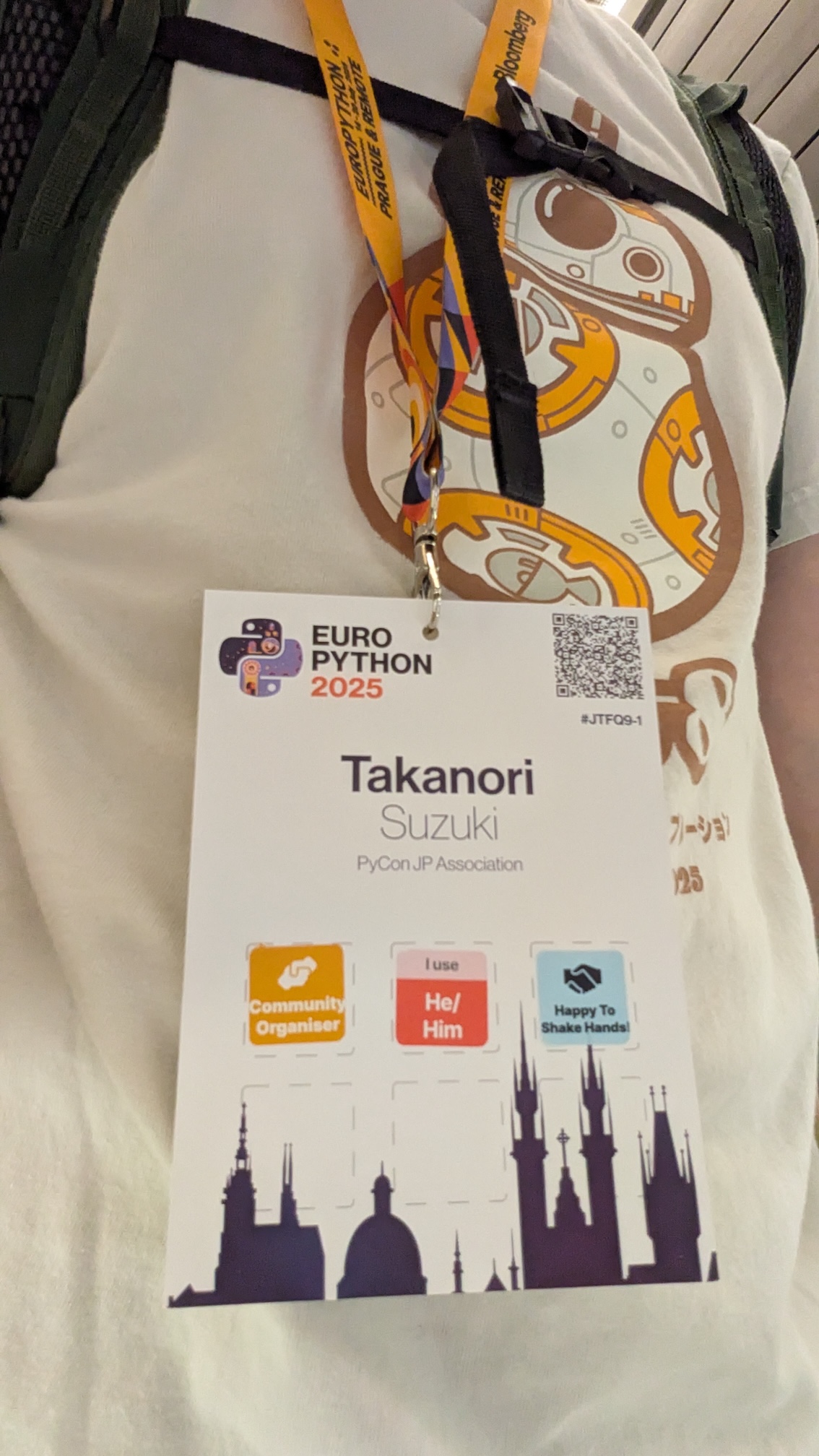 プラハに到着したらとりあえずホテルにチェックインし、カンファレンス会場で受付を行いました。 名札には自分の属性などをステッカーで貼り付けられます。