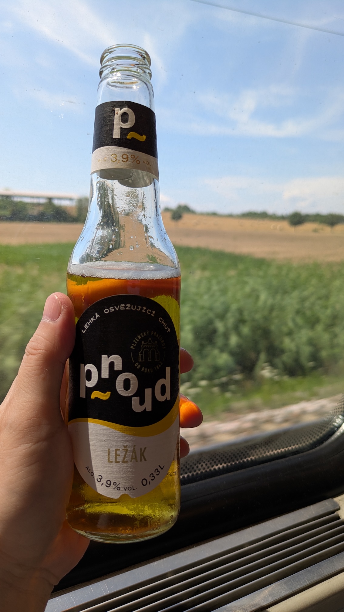 次の日はウィーン中央駅から列車で4時間かけてプラハに向かいます。 列車内は広い席と電源もあり快適に作業できました。 車内販売でビール(0.8 EURと激安!)も飲みました。