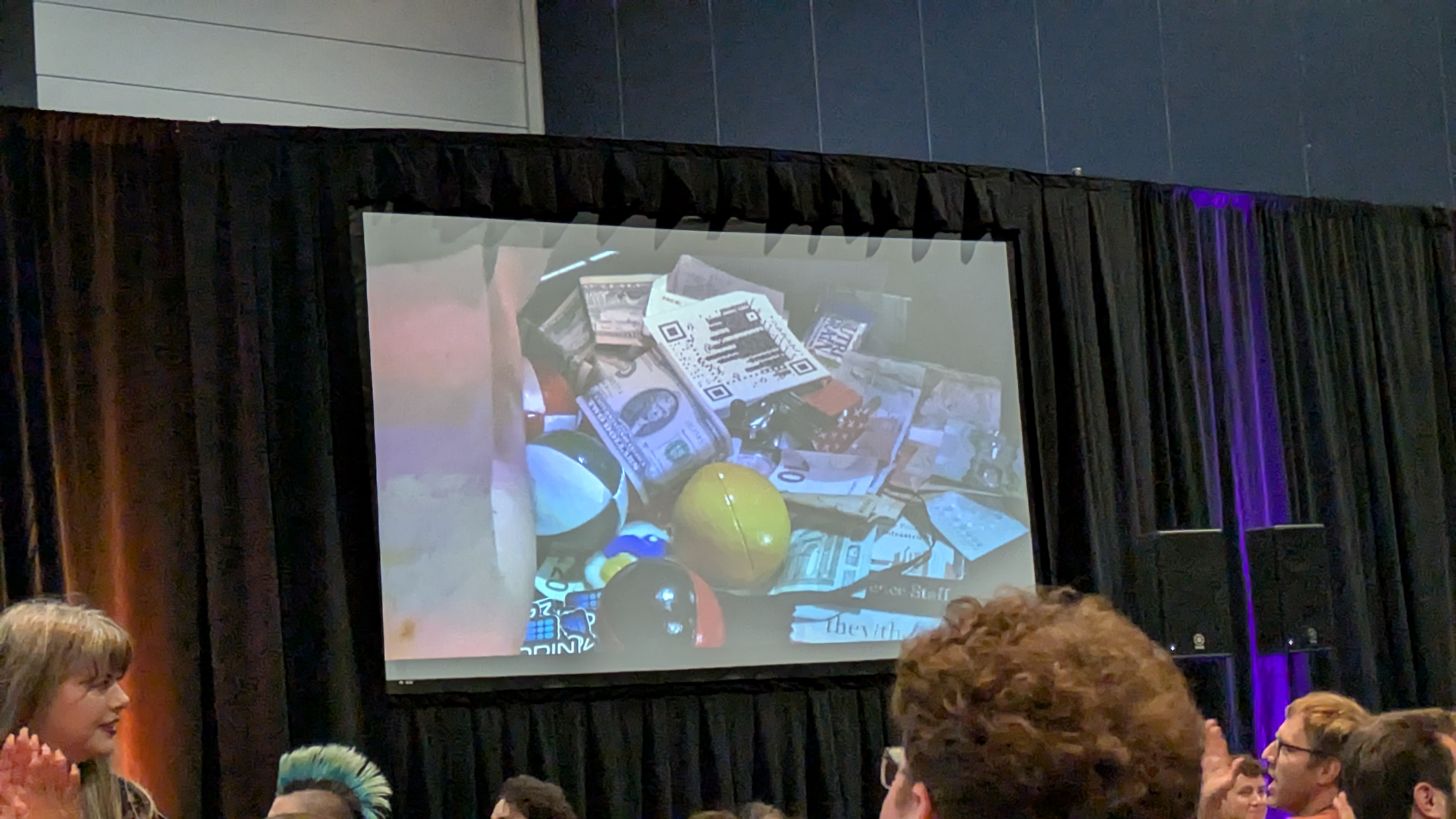 オークションで全ての商品が終わった後に会場から「ペン!!」という声があがりました。 これは、商品を写すモニターに写り込んだペンをオークションしよう、という悪乗りです。 ペンのオークションが始まり300ドルになった頃に「他にこの○○のステッカーを付けます」みたいにMCがおまけを追加していたら、会場中の人がどんどん自分のコミュニティのステッカーを置き始めました。 さらに悪乗りした人が現金を置いて、さらに各国の参加者がさまざまなお金を置き始めて、カオスな状態になりました。 最終的にバッグが提供され、そのバッグにペンと全てのグッズを入れて落札者に渡され、オークションは終わりました。