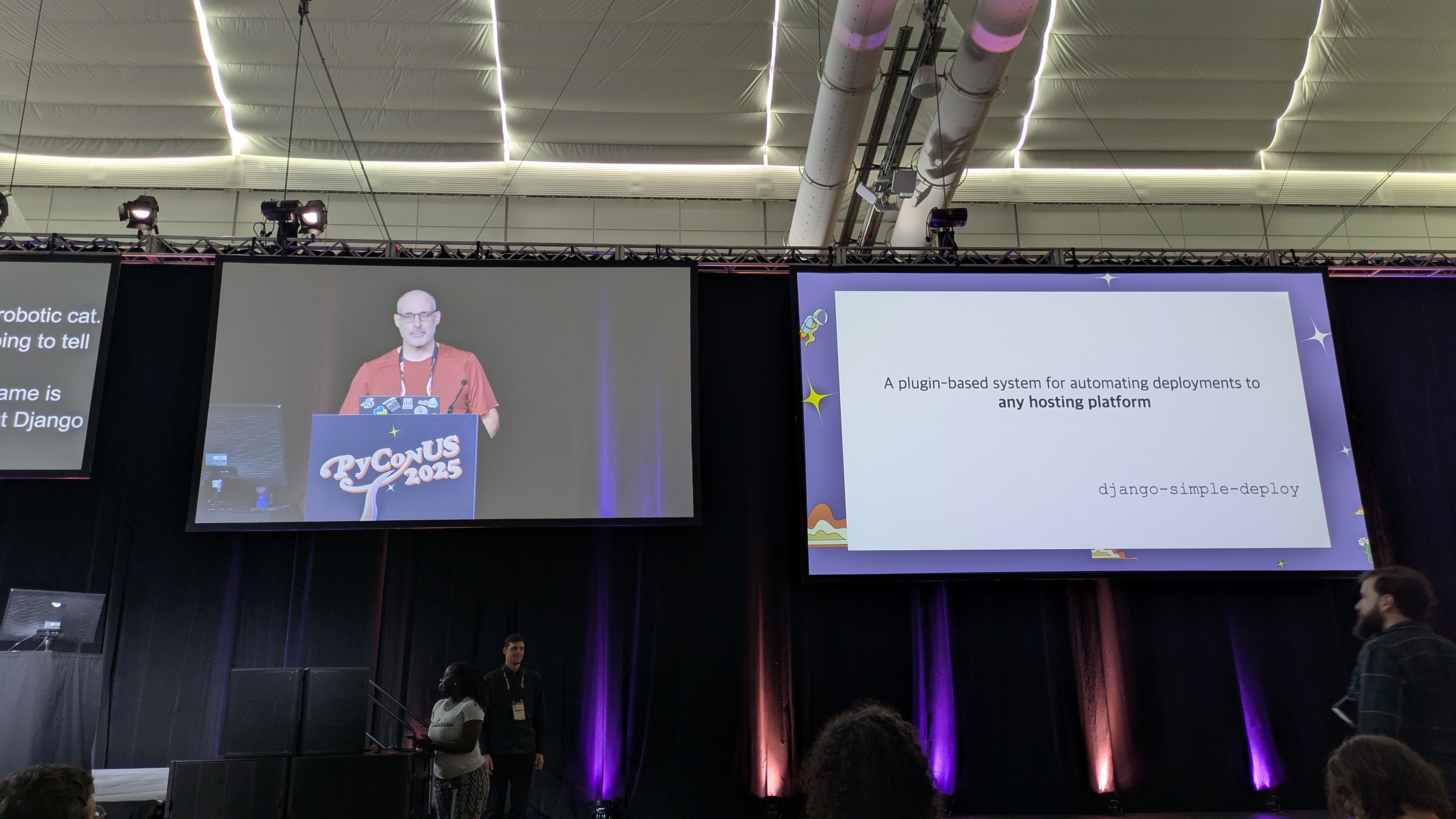 2日目朝のライトニングトークからはEric Matthes氏によるdjango-simple-deployを紹介します。 django-simple-deployはDjangoのプロジェクトを各種プラットフォームに簡単にデプロイできるライブラリです。 現在はFly.io、Platform.shとHerokuに対応しており、実際にデプロイするデモを行いながらトークを進め、今後さらに対応プラットフォームを増やしたいので協力して欲しいという話をしていました。